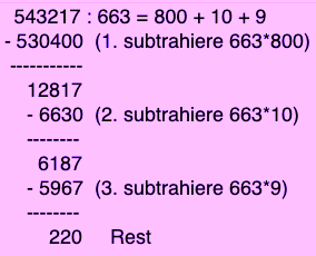 Die schriftliche Division beantwortet die Frage, wie oft man eine kleinere Zahl von einer größeren abziehen kann. Das Verfahren besteht darin, bei jedem Schritt ein möglichst großes, aber übersichtliches Vielfaches der kleineren Zahl ("Divisor") von der größeren Zahl ("Dividend") abzuziehen. Da man bei jedem Schritt den Divisor nur mit einer Ziffer multiplizieren möchte, sind die übersichtlichen Vervielfacher des Divisors einziffrige Vielfache von Zehnerpotenzen. Im Beispiel 800, 10, 9. Die schriftliche Division übt daher das Verständnis unserer dezimalen Zahldarstellungen. Das ist wichtig, weil Rechtschreibprogramme keine Zahlenangaben überprüfen können, und ebenso, weil späteres symbolisches Rechnen ("Termumformungen") Erfahrung mit Zahlenrechnungen voraussetzt. |